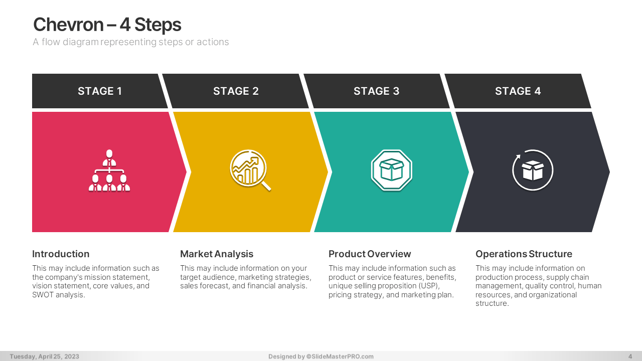 Our Chevron Arrow PowerPoint templates provide a professional and efficient way to present your business or project processes, stages, phases, step-by-step instructions, timeline, or workflow. The pre-designed templates are ready to use, allowing you to easily copy and paste them into your presentation and save time on design.